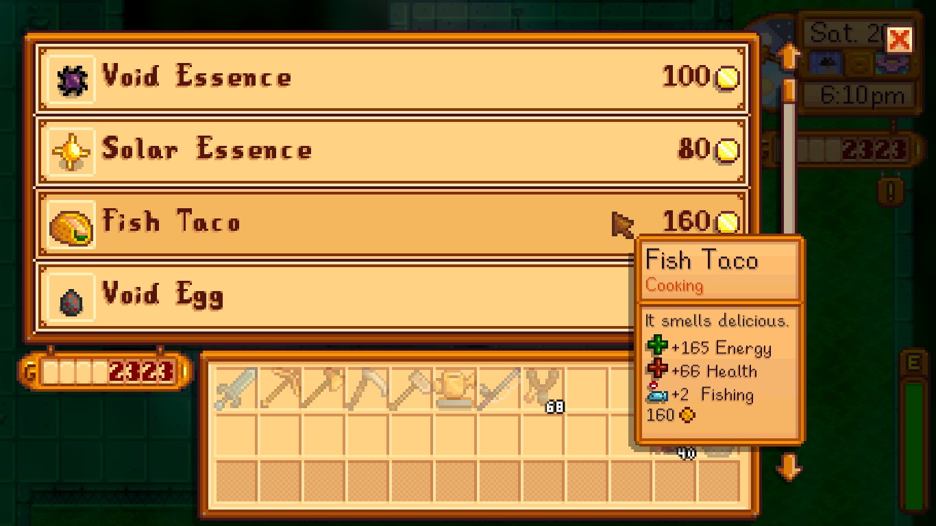 Some fish can be bought at the traveling merchant cart in cindersap forest or by krobus in the sewers. Linus is a villager who lives in a small tent north of pelican town near the mines. Shown below are linus' schedules prioritized highest to lowest within each season. She is never seen actually helping evelyn with the gardens, no. The fishes are located in the the beach, the ridge lake, and ridgeside village river. Fish taco may randomly appear in krobus ' shop on saturdays or in the stardrop saloon 's rotating stock. The following is a sortable table of gifts relevant to each villager in stardew valley. Fish can be found in the ocean, lakes, rivers, and in certain levels of the mines. As many players know, keeping your stamina and health high is an essential part of playing the game. Dish o' the sea is a cooked dish.it is prepared using either the kitchen inside an upgraded farmhouse or a cookout kit. The reward for completing the specialty fish bundle in the fish tank is 5 dish o' the sea. Upon catching them, the name of the fish and its length are displayed. Top posts september 15th 2016 top posts of september, 2016 top posts 2016.